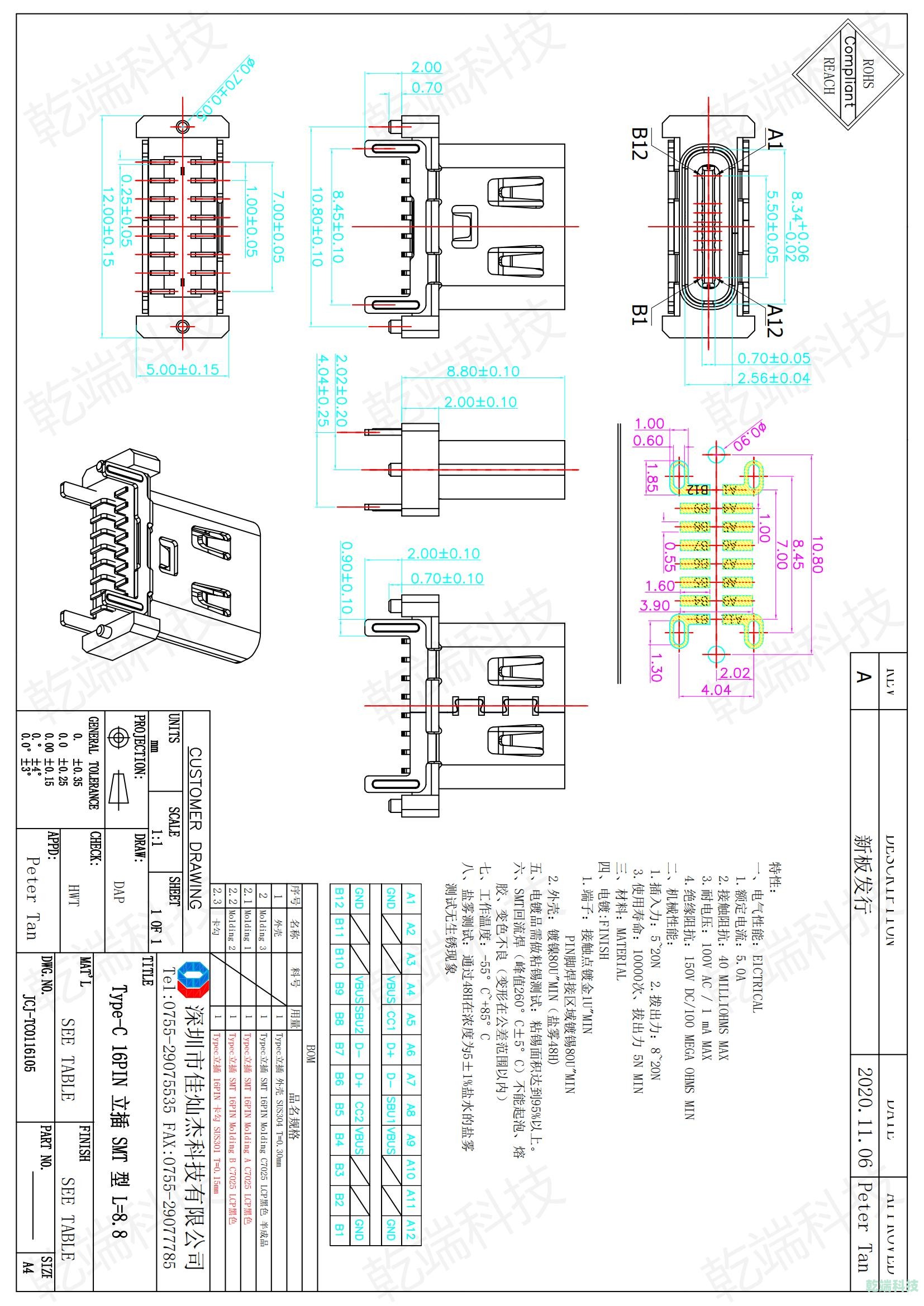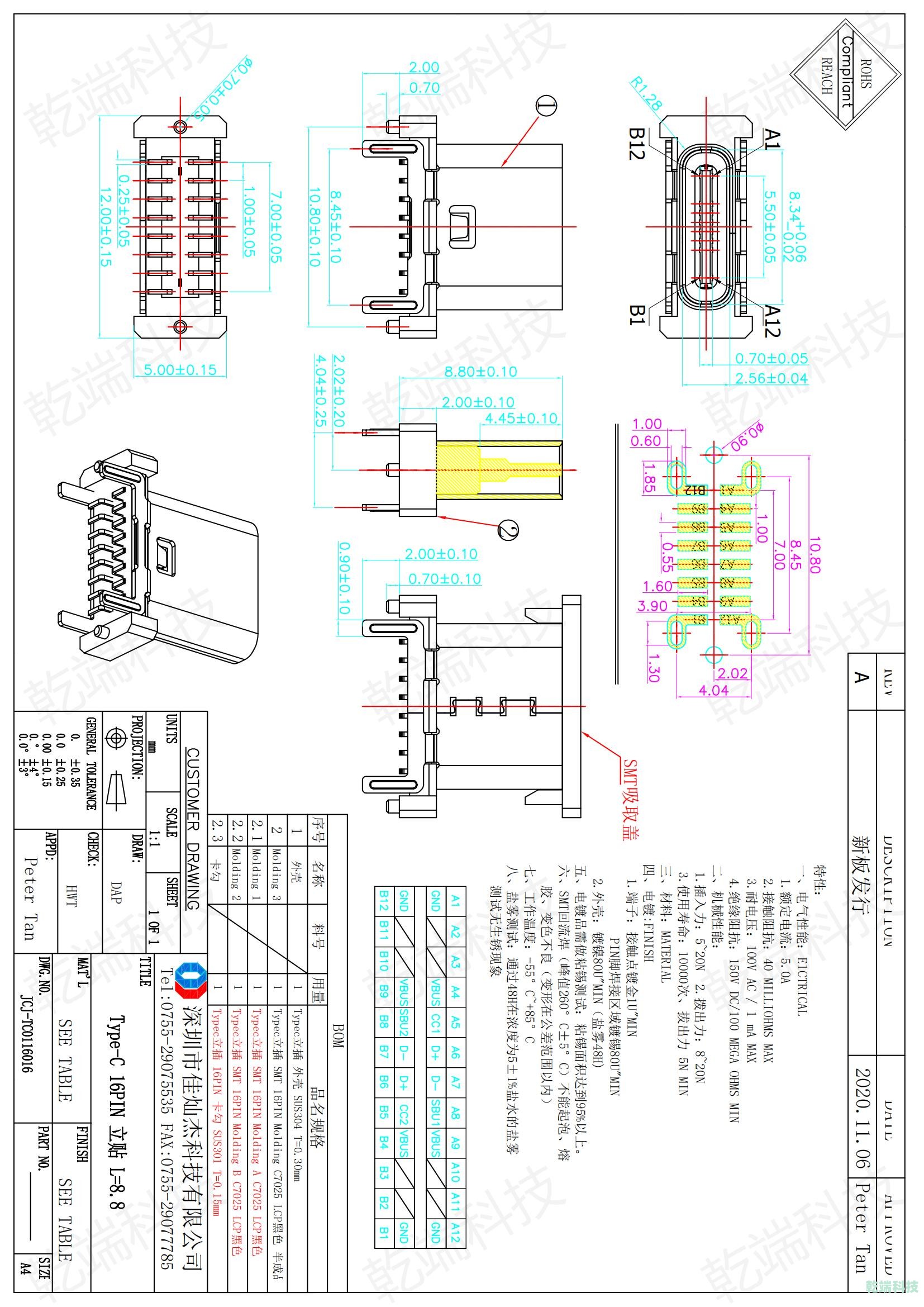 Typec CF 立貼 SMT 16PIN C7025 LCP黑色 H=8.8 &(外殼帶彈片)
