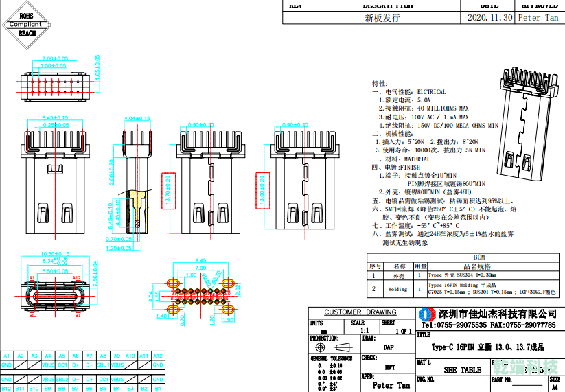 Typec CF 16P立插13.0&13.7mm LCP黑色 7025 1U