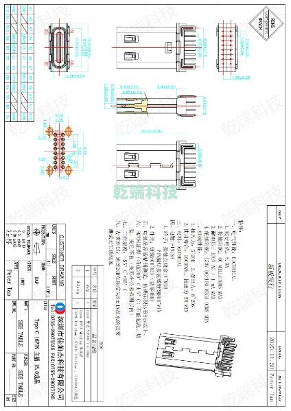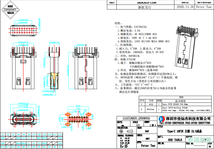 Typec CF 16P立插15.0mm LCP黑色 7025 1U