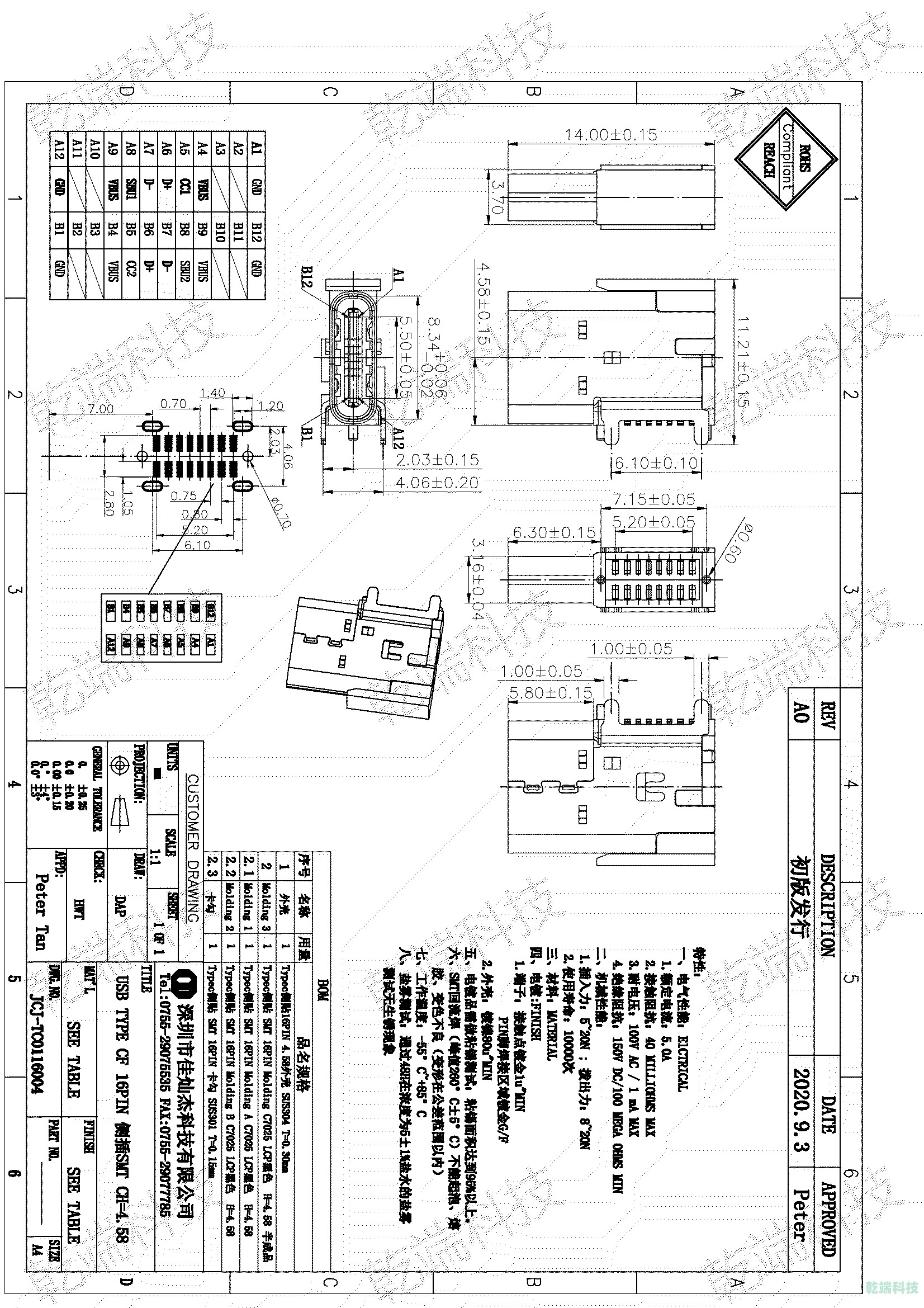 Typec CF 側(cè)貼 SMT 16PIN C7025 LCP黑色 H=4.58