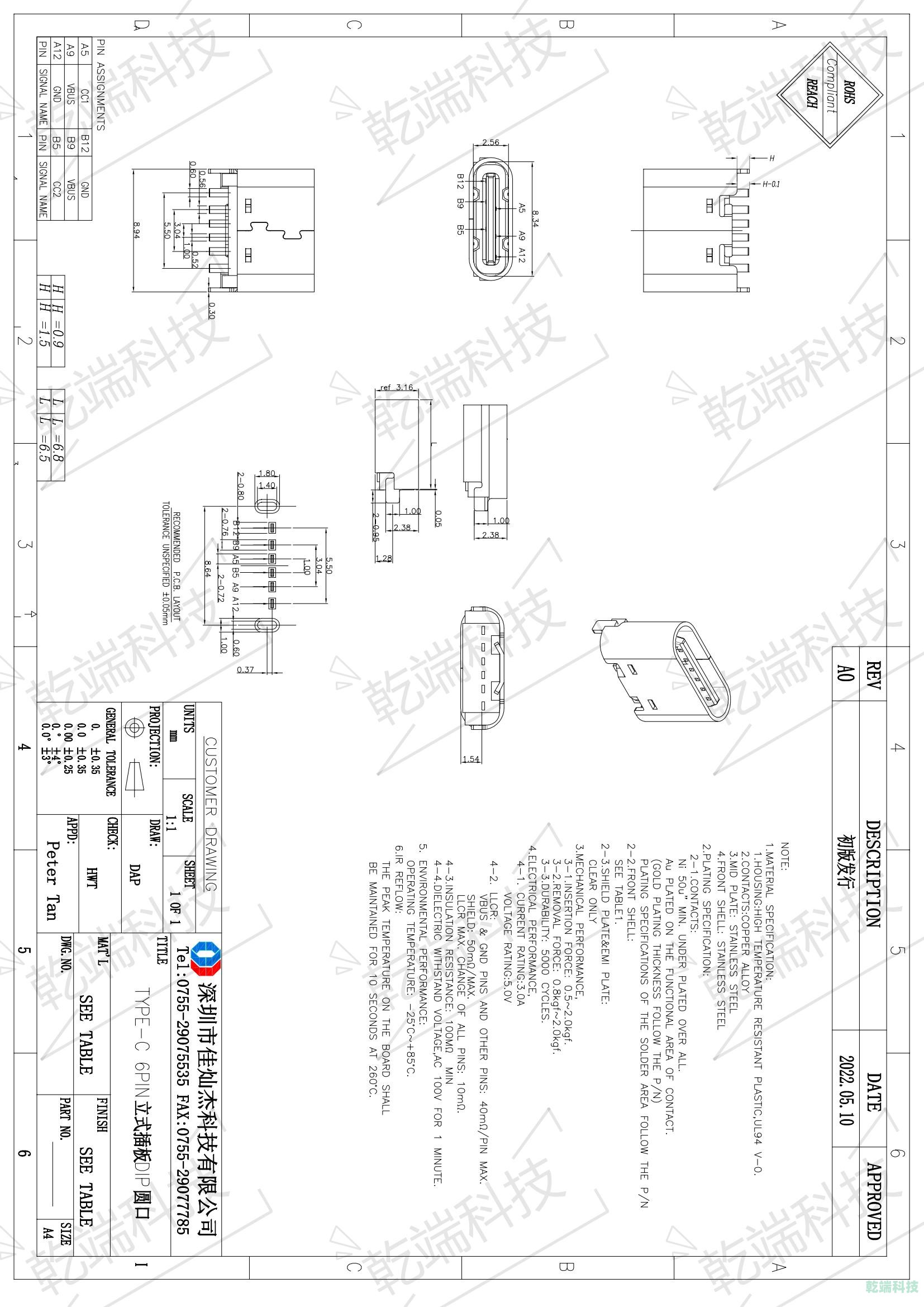 Typec CF 6PIN立式6.5mm&6.8mm 插板