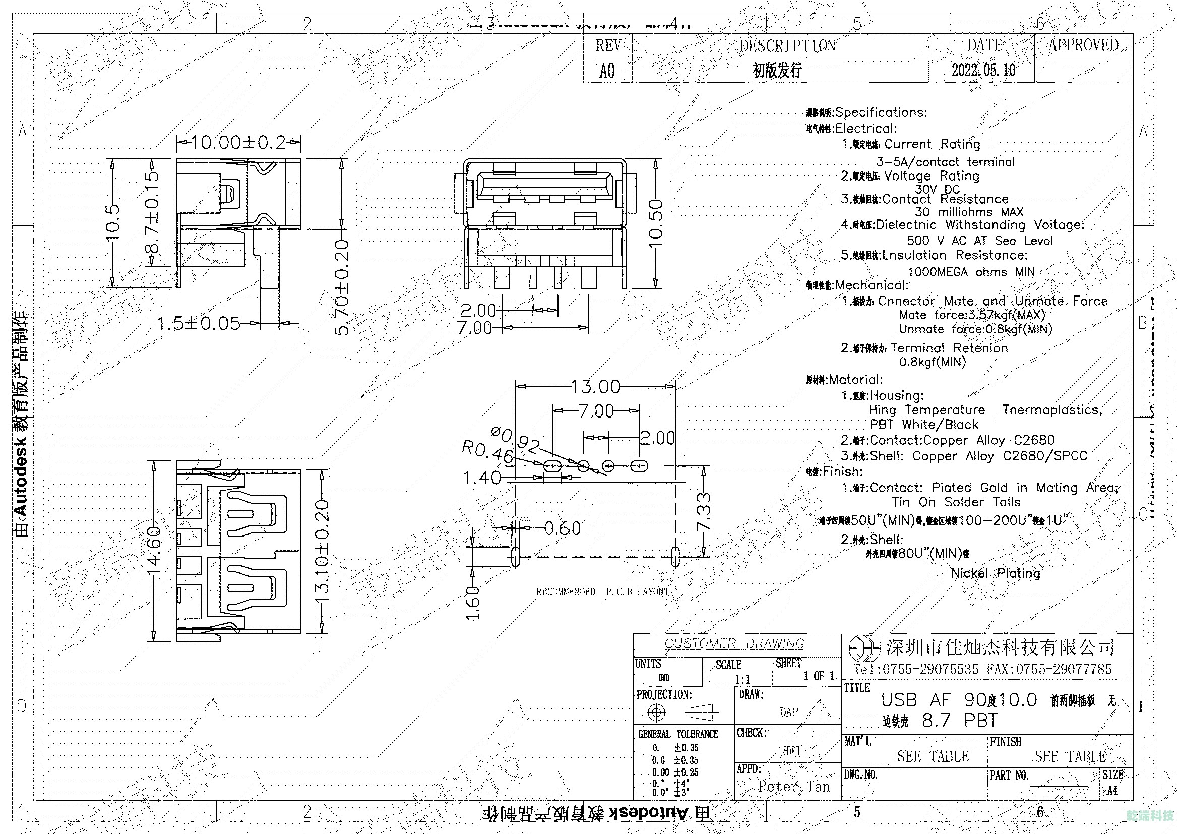 USB AF 90度 10.0 加高8.7 大電流 后插后插 平口有耳 PBT