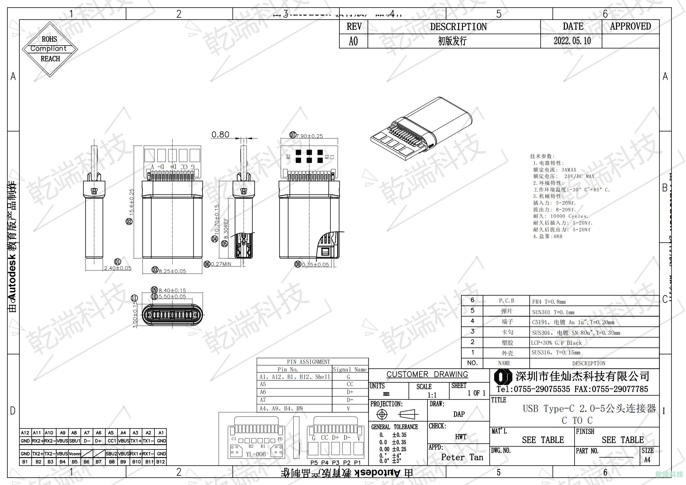 TYPE-C公頭 2.0 5個焊盤 C TO C