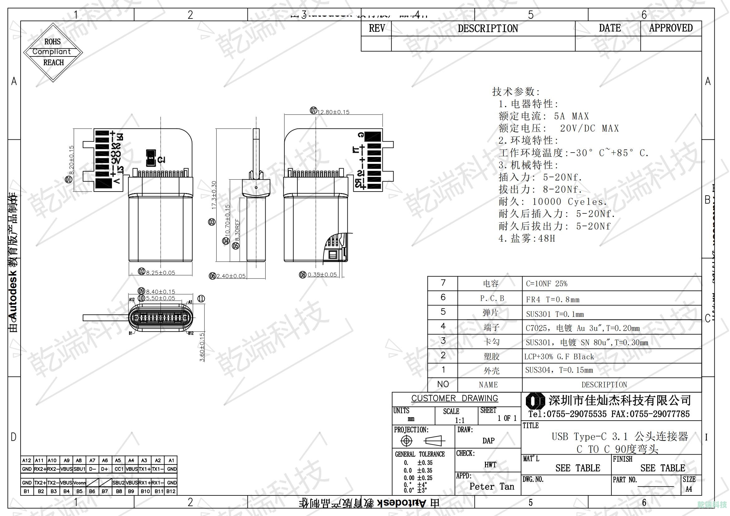 USB TYPE-C 3.1 公頭連接器 C TO C 90度彎頭 H=3.6